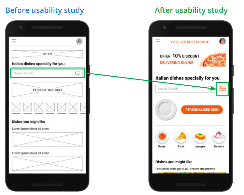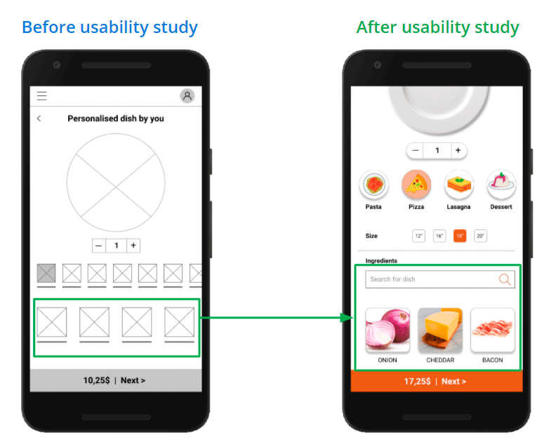 The usability studies made me realise that the way of filtering and finding dishes during the navigation and also with the ingredients during the process of creating the personalised dish had to be improved.