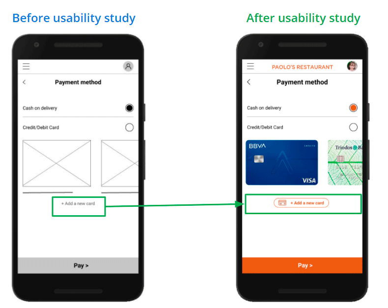 During the usability study, users did not notice the possibility of adding new cards to the payment mode. As a solution, a more prominent element with greater visual weight was proposed.