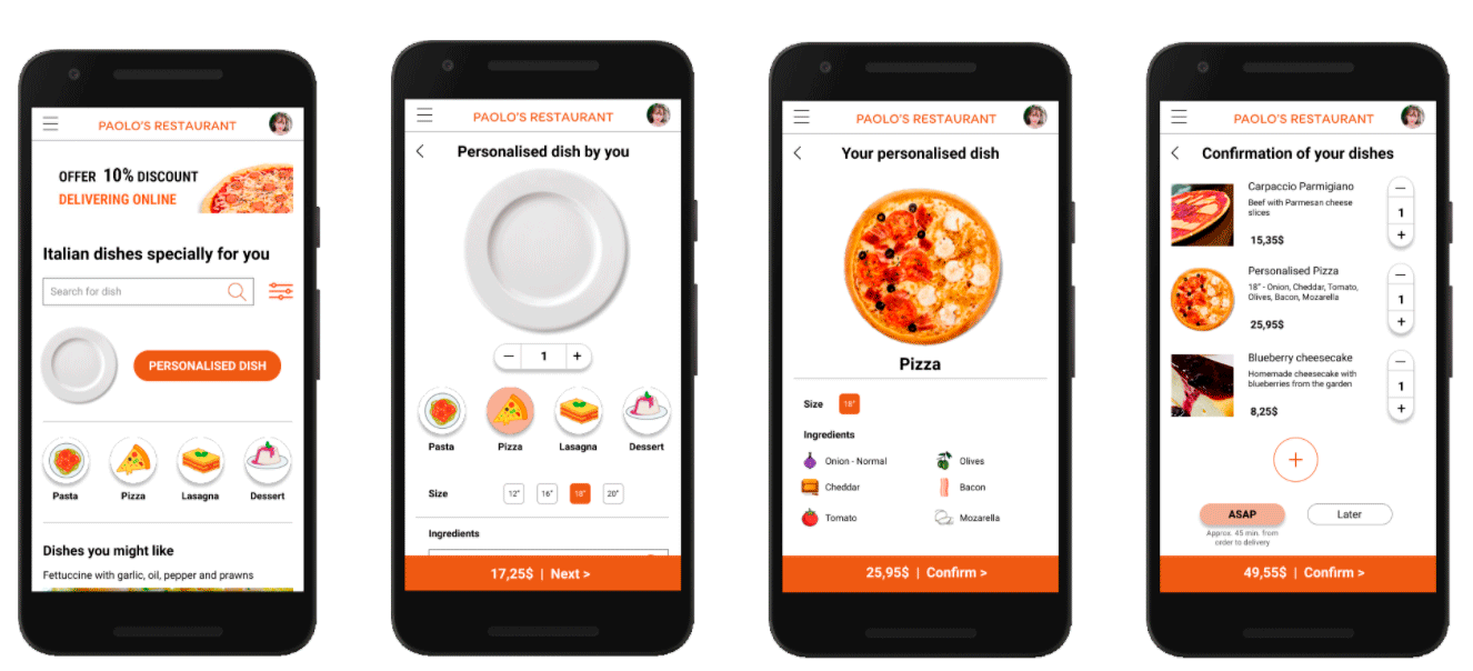 Design an application for Paolo’s Restaurant that allows users not only to order dishes from the menu, but also to order personalised dishes with ingredients and have them delivered to their home or work.