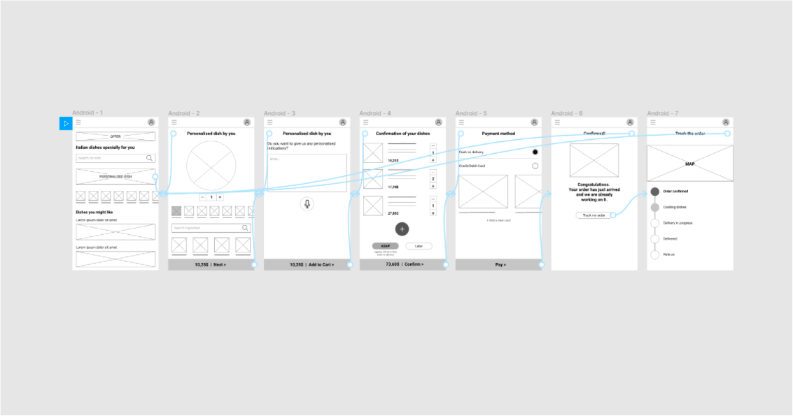 Work was done on paper wireframes for one of the app’s core processes, the ordering of a personalised dish, a critical functionality of the app that would set it apart from its competitors.