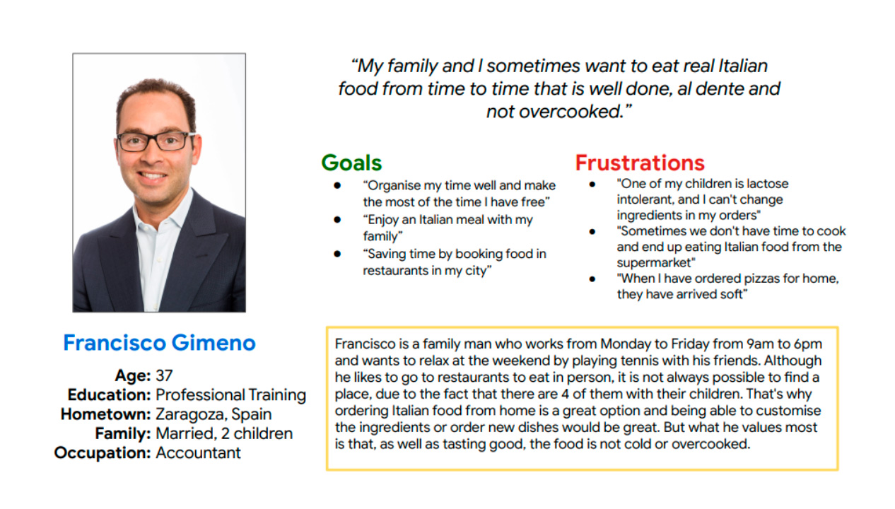 During the research phase, I conducted interviews with people similar to target audience and created an empathy map to understand their needs. This research showed that the main concerns of the users were that although they loved italian food and knew what they liked, they were not able to prepare it properly.