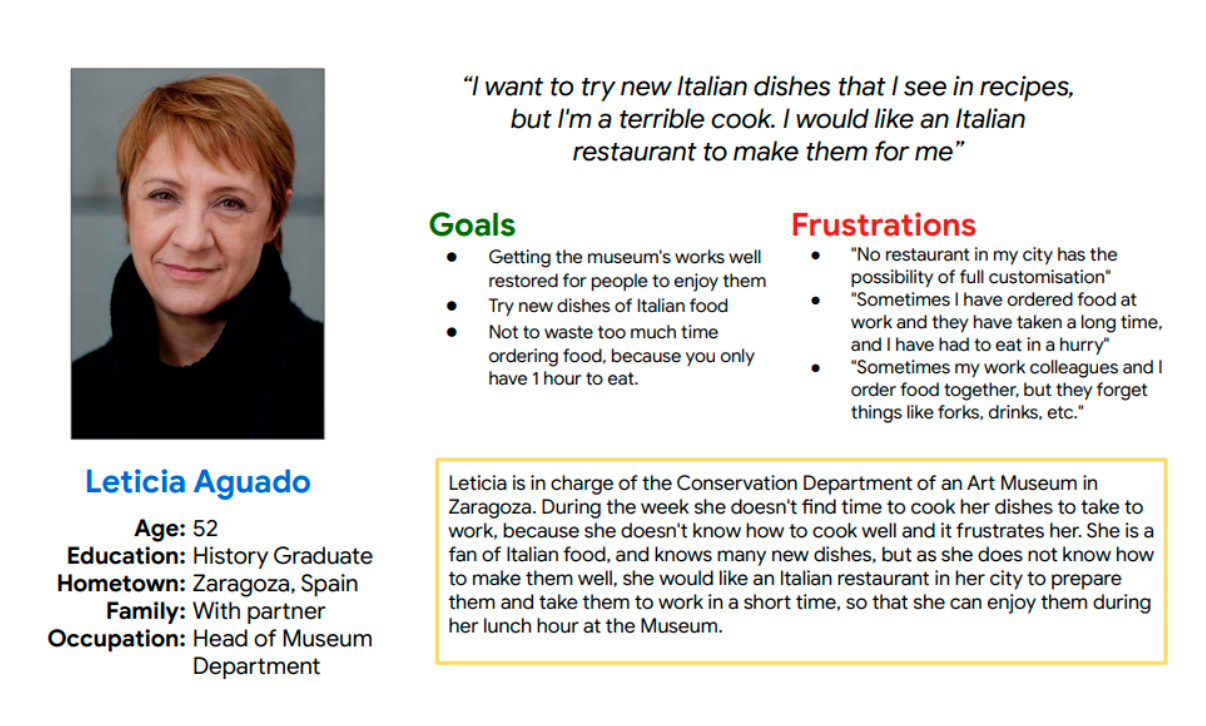 Leticia is a museum worker who has no time to cook and prefers to order food every day for her office because she would love to be able to order dishes customised to her taste.