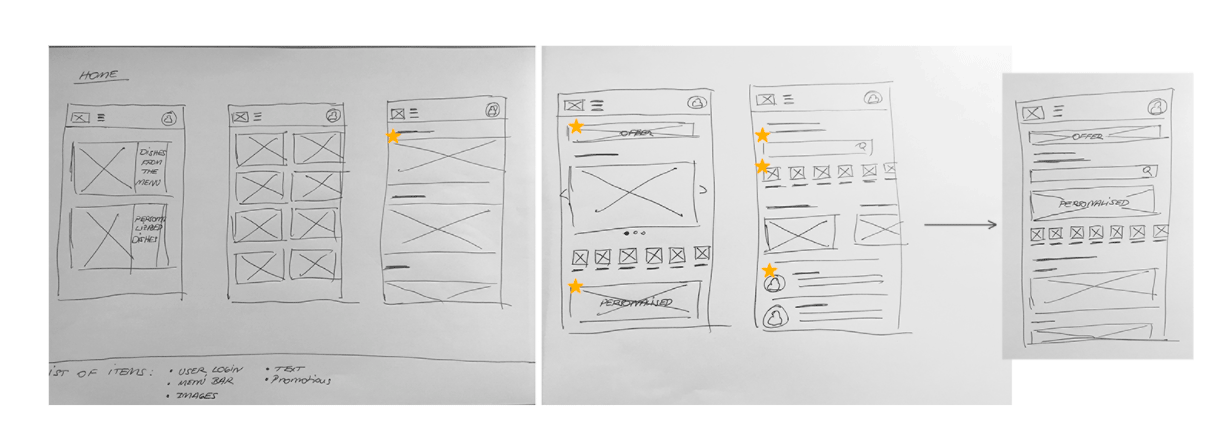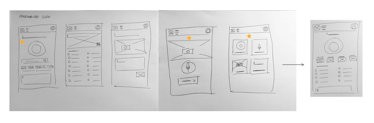Stars were used to mark the elements of each sketch that would be used in the initial digital wireframes.